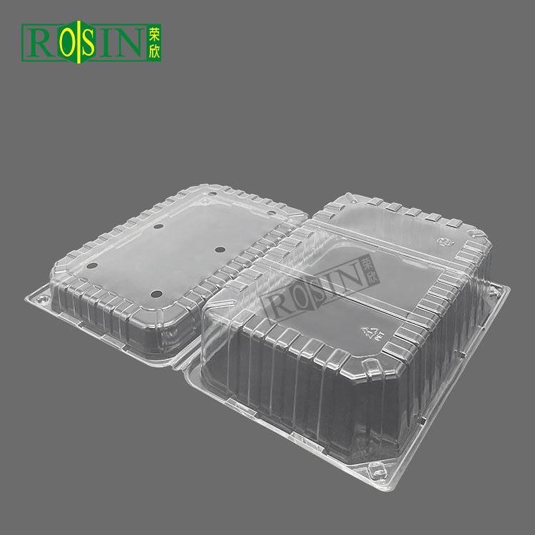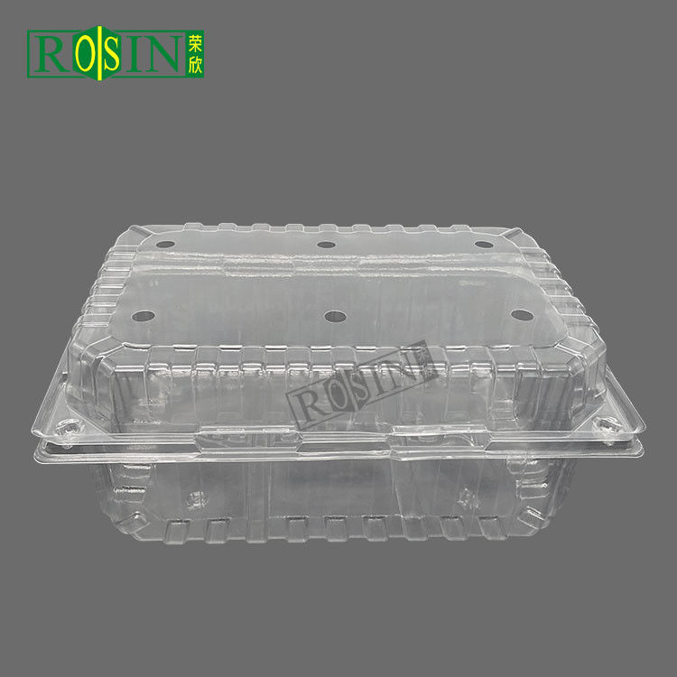custom-made disposable rectangular transparent fruit containers made from PET material. These containers are highly transparent and impact-resistant. The fruit box comes with a lid and vents, allowing for effective ventilation to maintain the freshness and texture of the fruits. Our product features a thickened design with reinforced ribs for added strength and stability. The lid ensures a tight seal and a secure latch, guaranteeing the safety of the fruits during transportation and display.